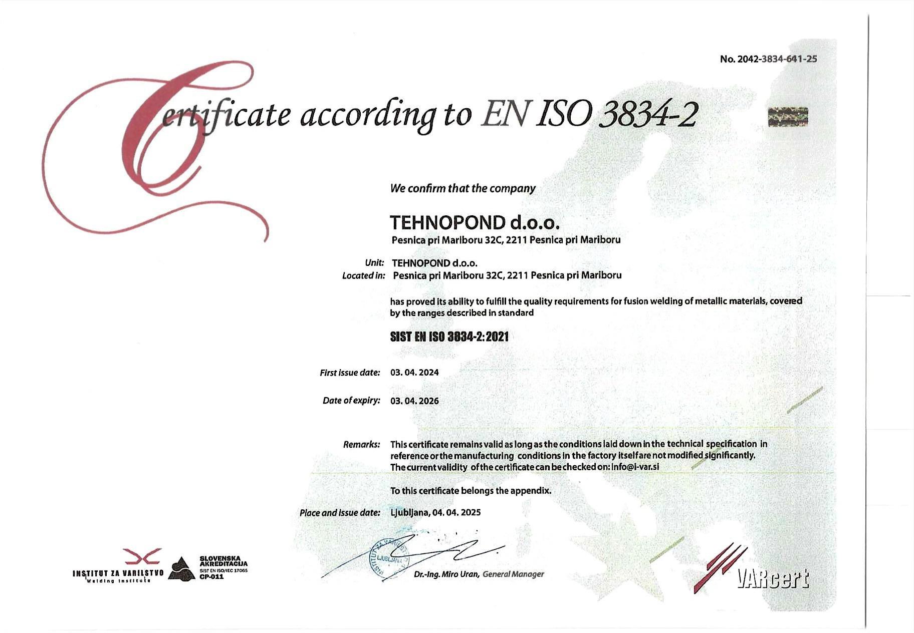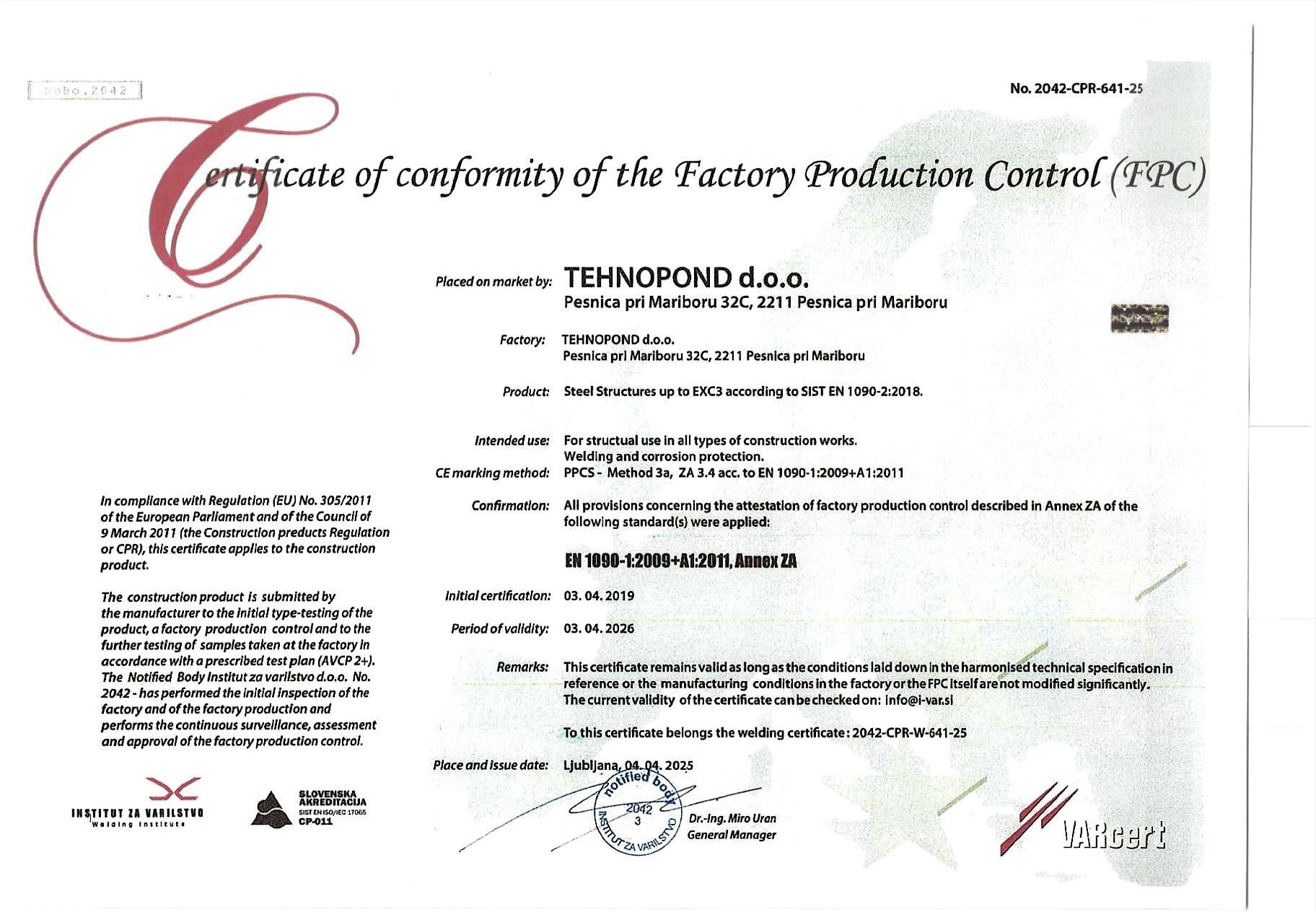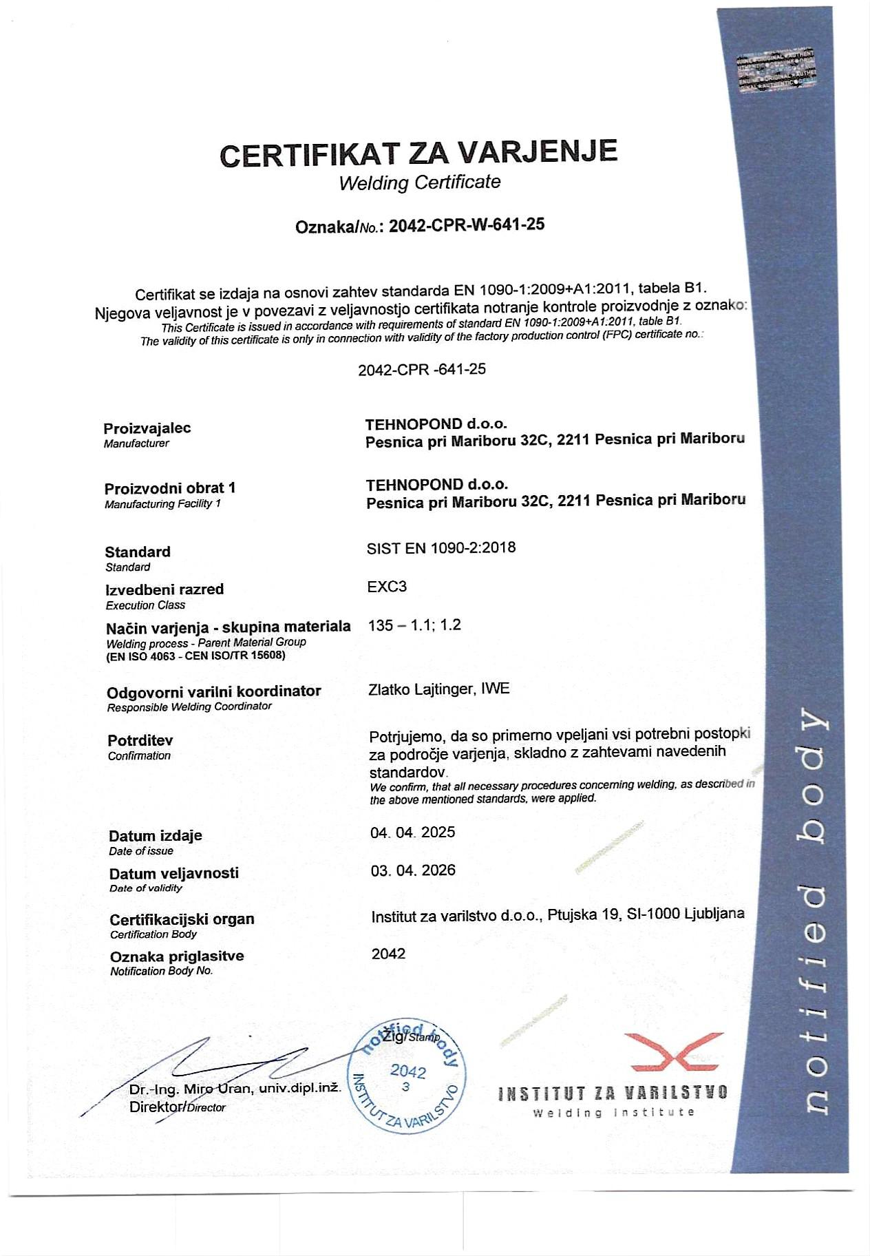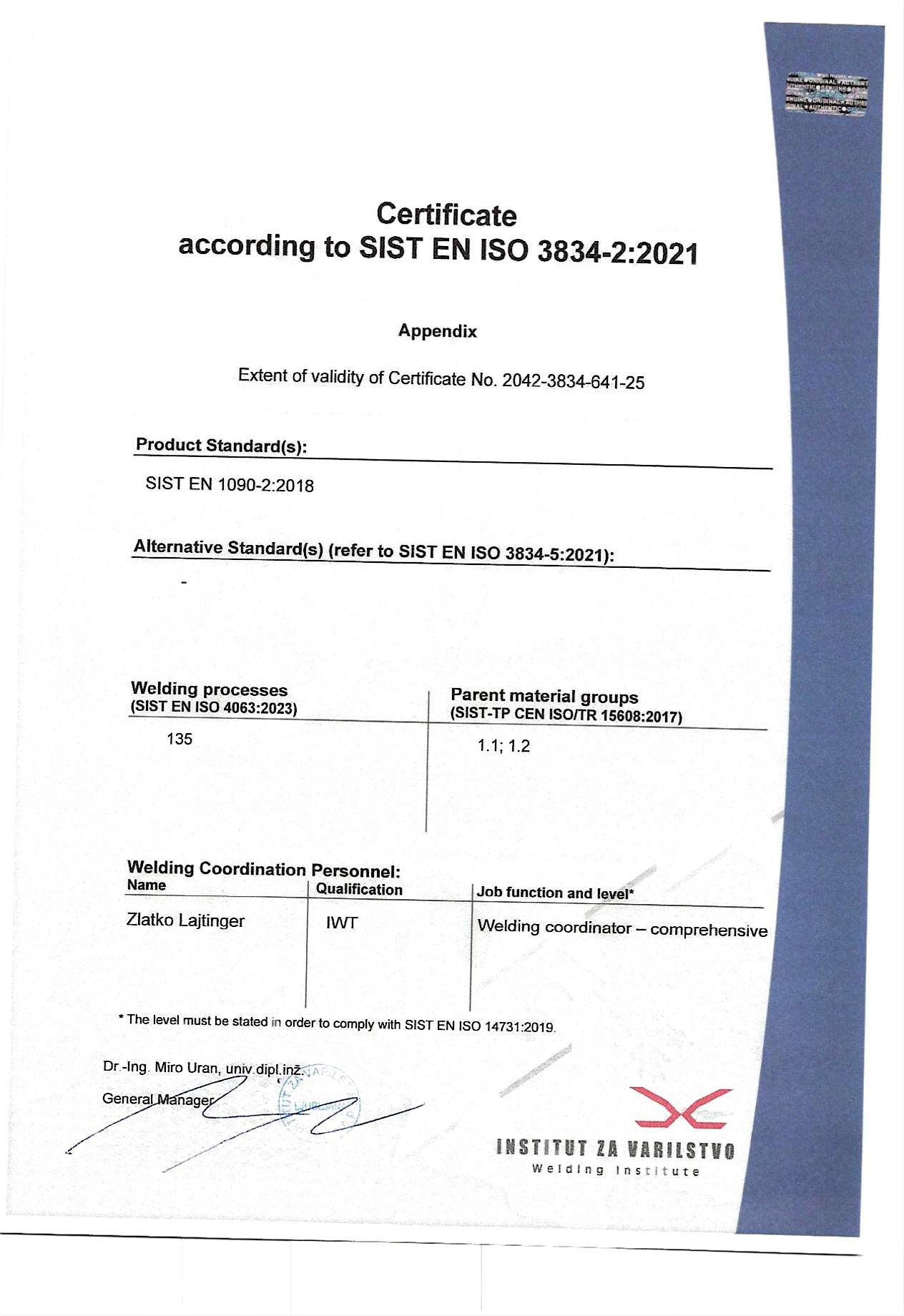 Smo certificirano podjetje, ki ima poleg certifikatov ISO 9001 in ISO 3834 tudi proizvodni standard EN 1090-1.